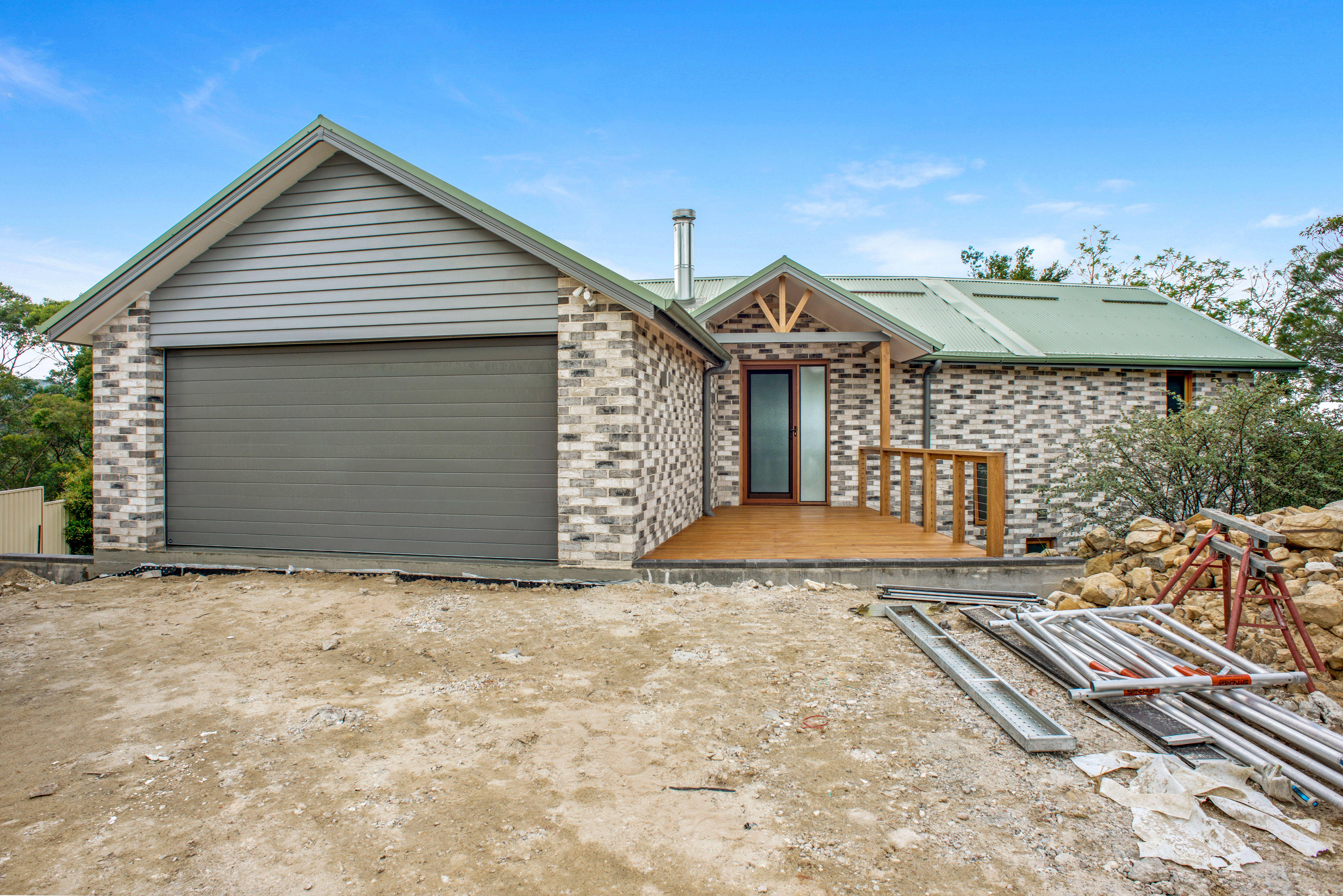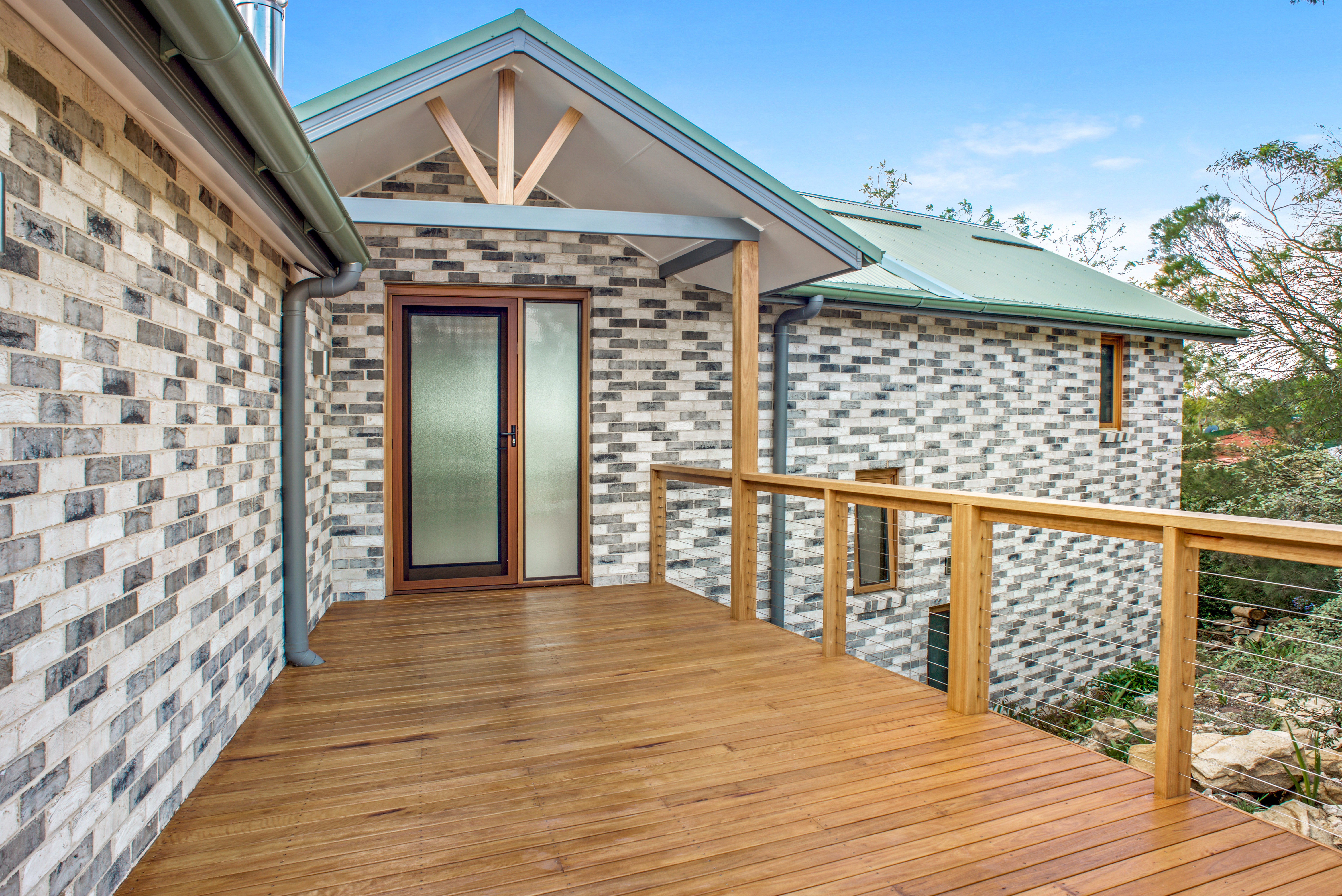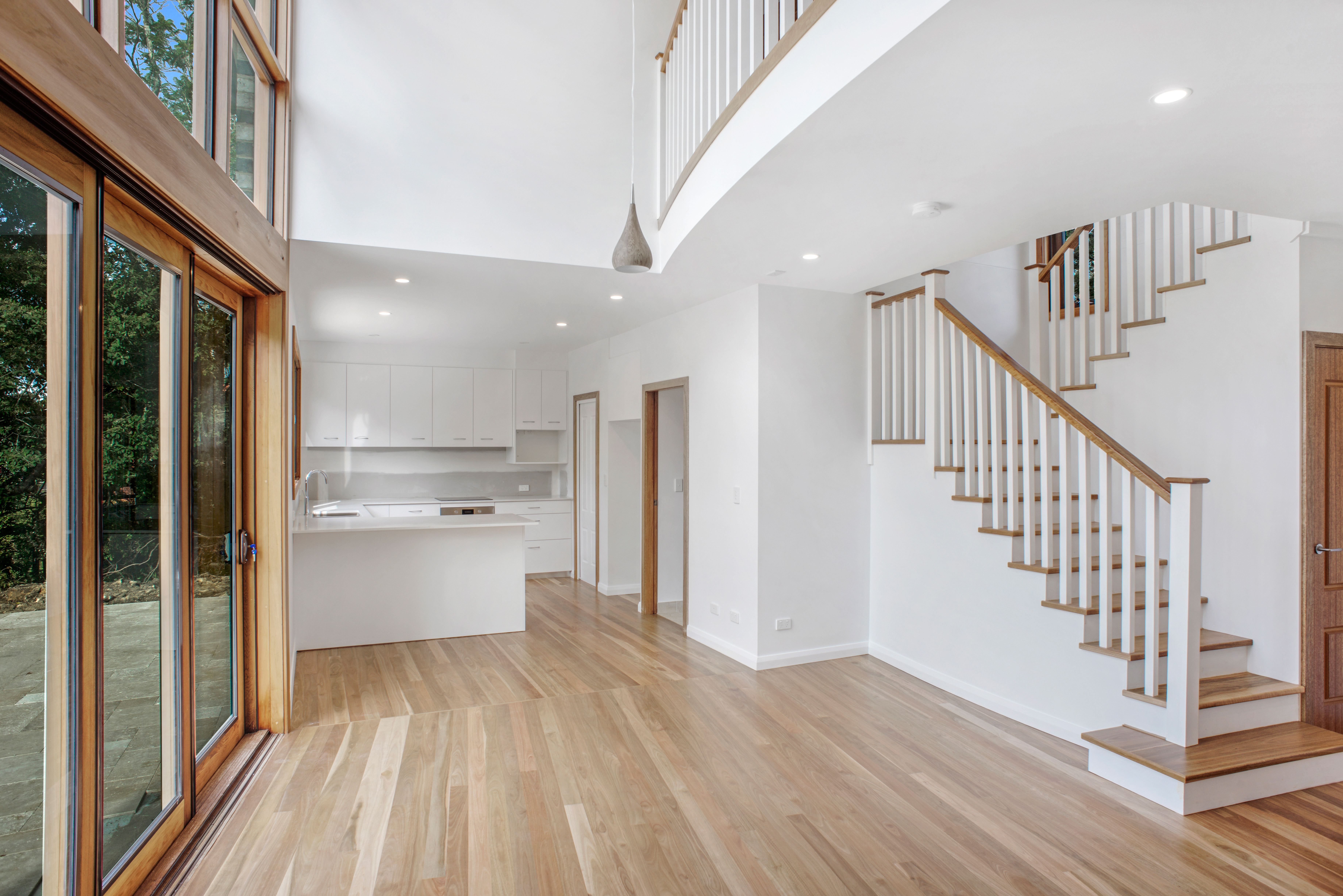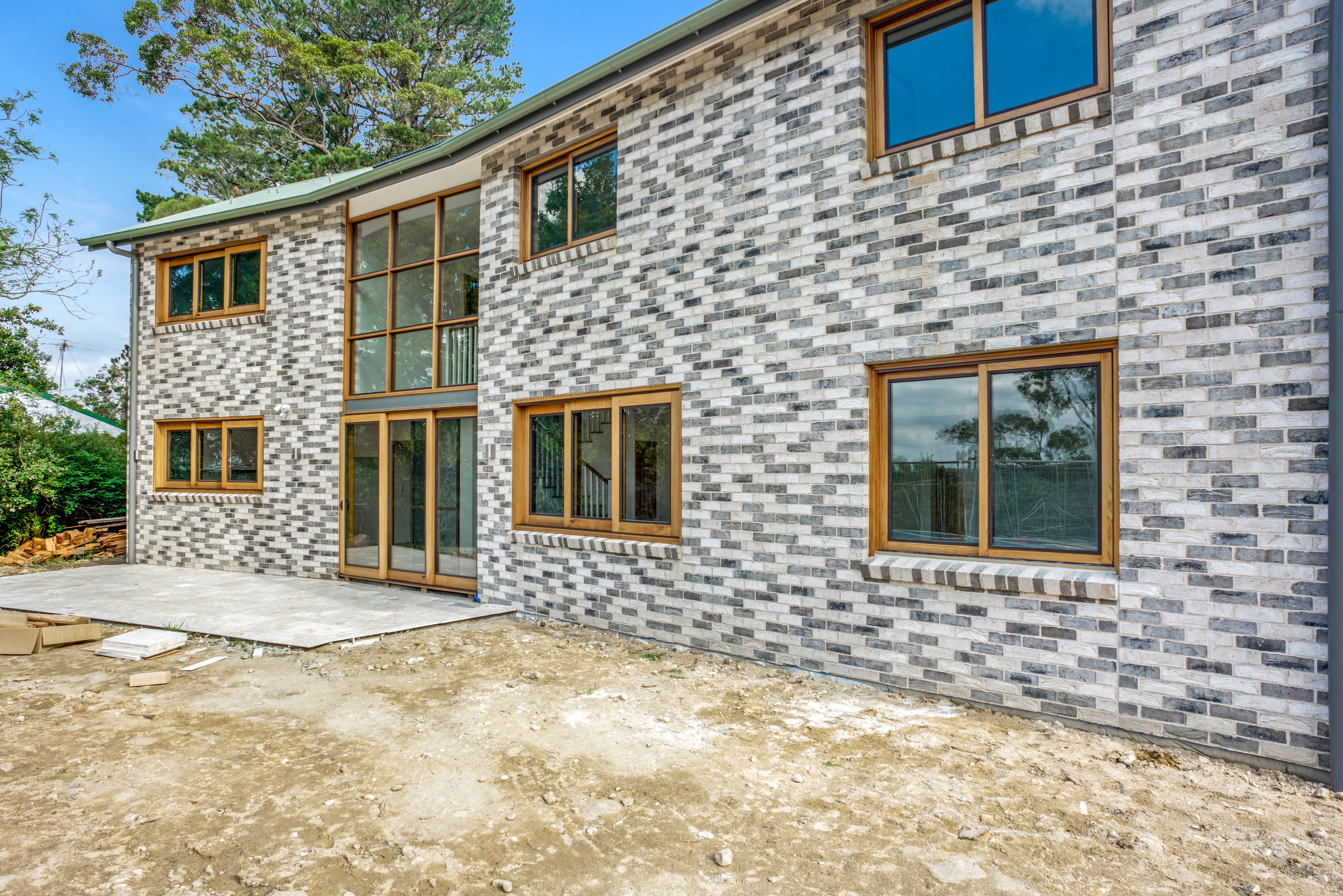 This modern, brick home was constructed in a BAL-40 zone on a sloping block. Split levels and retaining walls allowed us to create a large open living area on the ground floor. Bringing in huge amounts of natural light in the large 6 metre high atrium. This building incorporated a curved wall and different angled wings to make the most of the natural light and add some creative shape to this home
